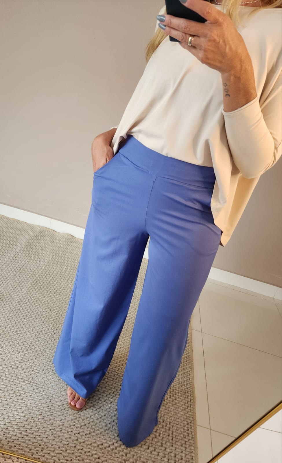 Calça pantalona de viscose com elastano na cor azul , com bolsos e