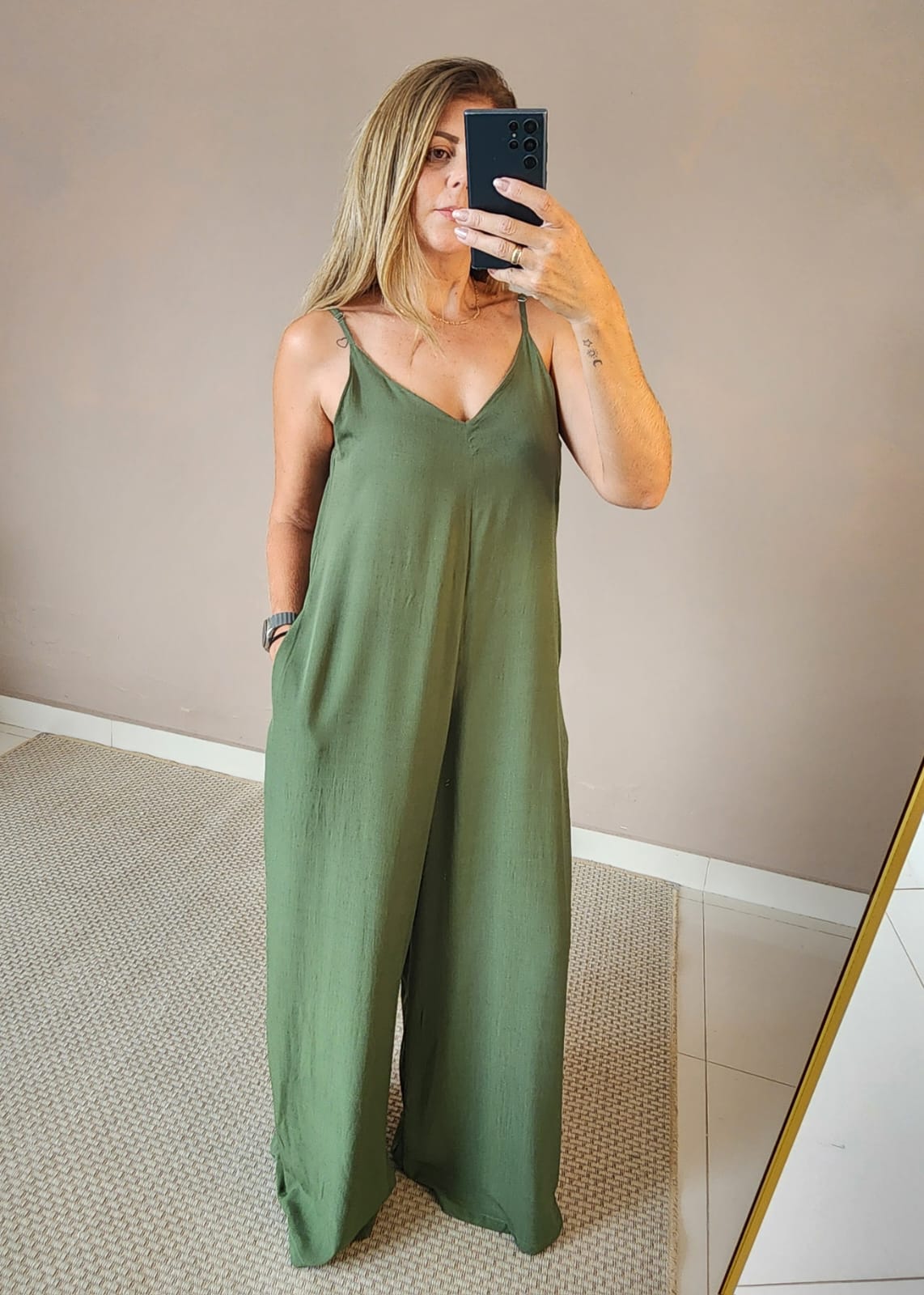 Macacão modelo pantalona no tecido viscolinho na cor verde com bolsos e fechamento nas